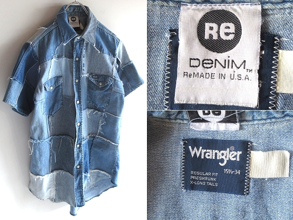- USA製 Re DeNIM Wrangler ラングラー 80sビンテージ基礎 クレイジーパッチワーク リメイク デニムシャツ ウエスタンシャツ 15H インディゴ