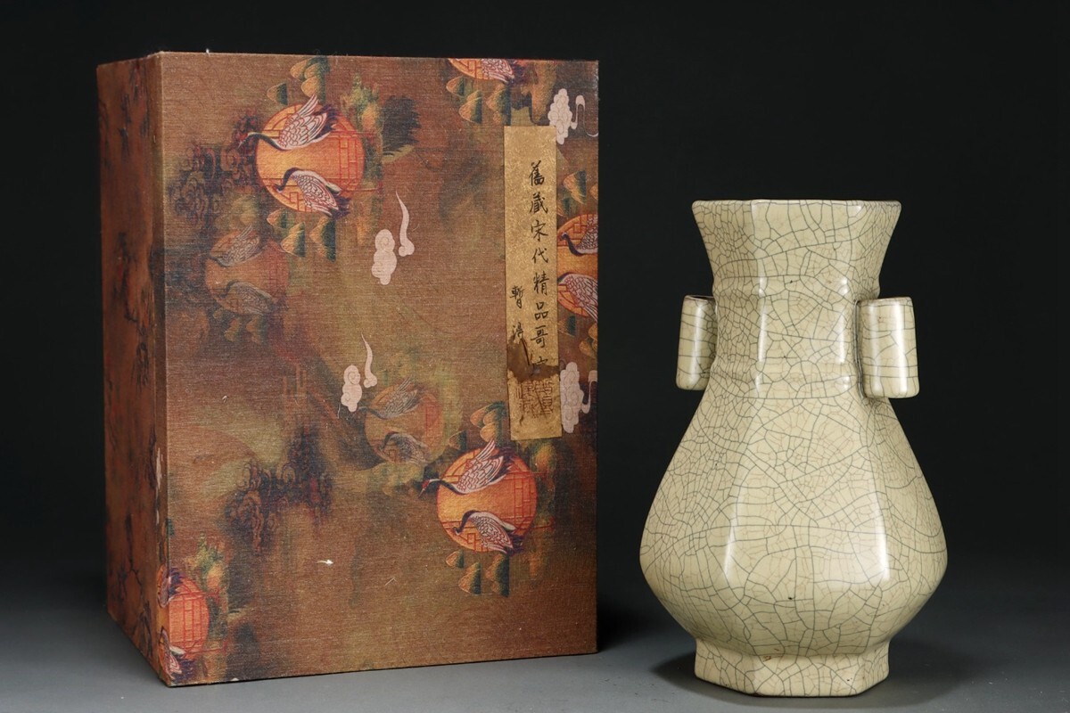 - 「宋 哥窯 陶磁器 六方貫耳瓶」染付 置物 擺件 古賞物 中国古美術 旧蔵出