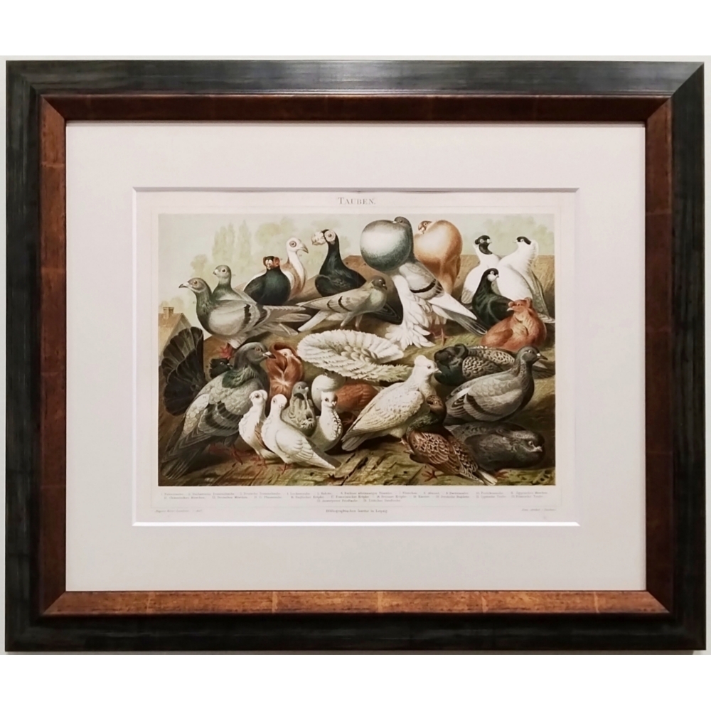 - ハトの図版 マイヤー百科事典 1897年 ドイツ リトグラフ 版画 鳩 博物図譜 アンティーク 紙もの 骨董 額付