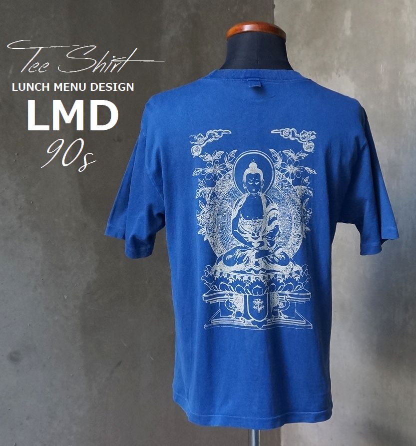 > 90s 日本製 LMD LUNCH MENU DESIGN 青 ブルー オーム Om 聖観音 染み込みプリント 半袖 Tシャツ M相当