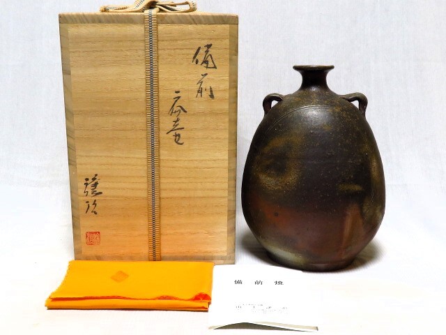 - 備前扁壷 山下譲治 共箱 共布 栞 双耳 花器 花生 備前焼