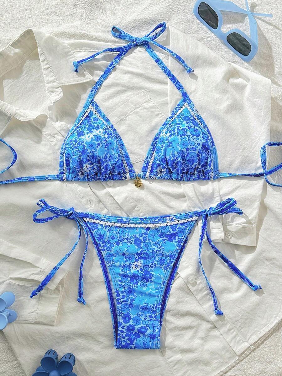 - レディース 水着 ビキニセット ランダムな小花柄フリルストラップセクシースパゲッティストラップビキニセット、夏向け