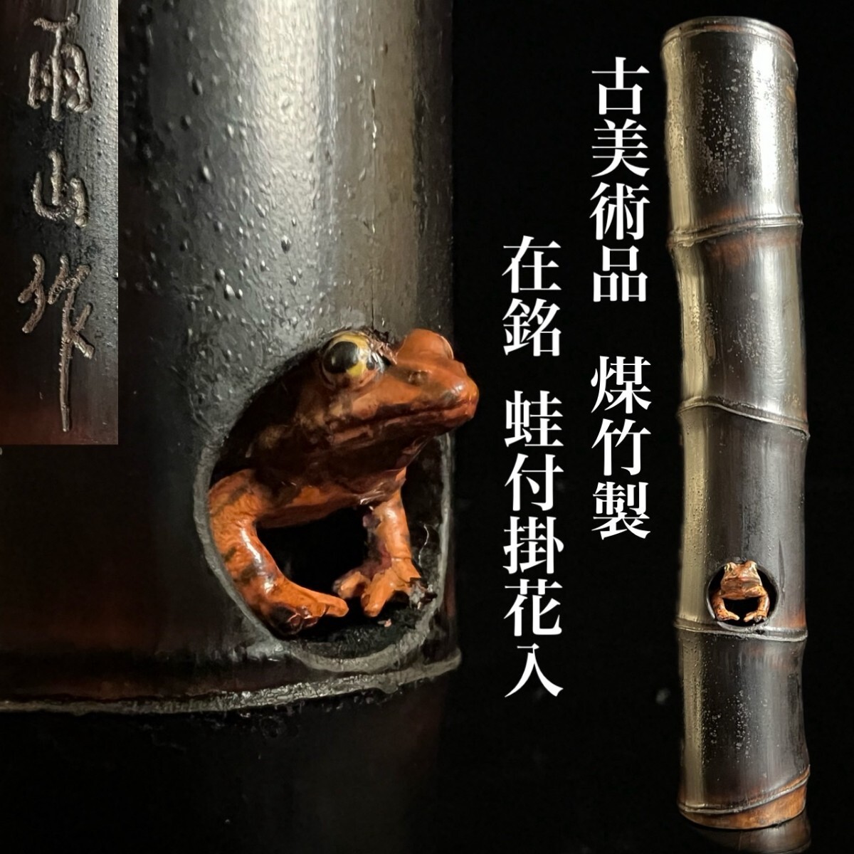 - 古美術品 煤竹製 在銘 雨山作 蛙付掛花入 23cm 細密彫刻 時代 竹工藝 茶道具 唐物骨董[麌]