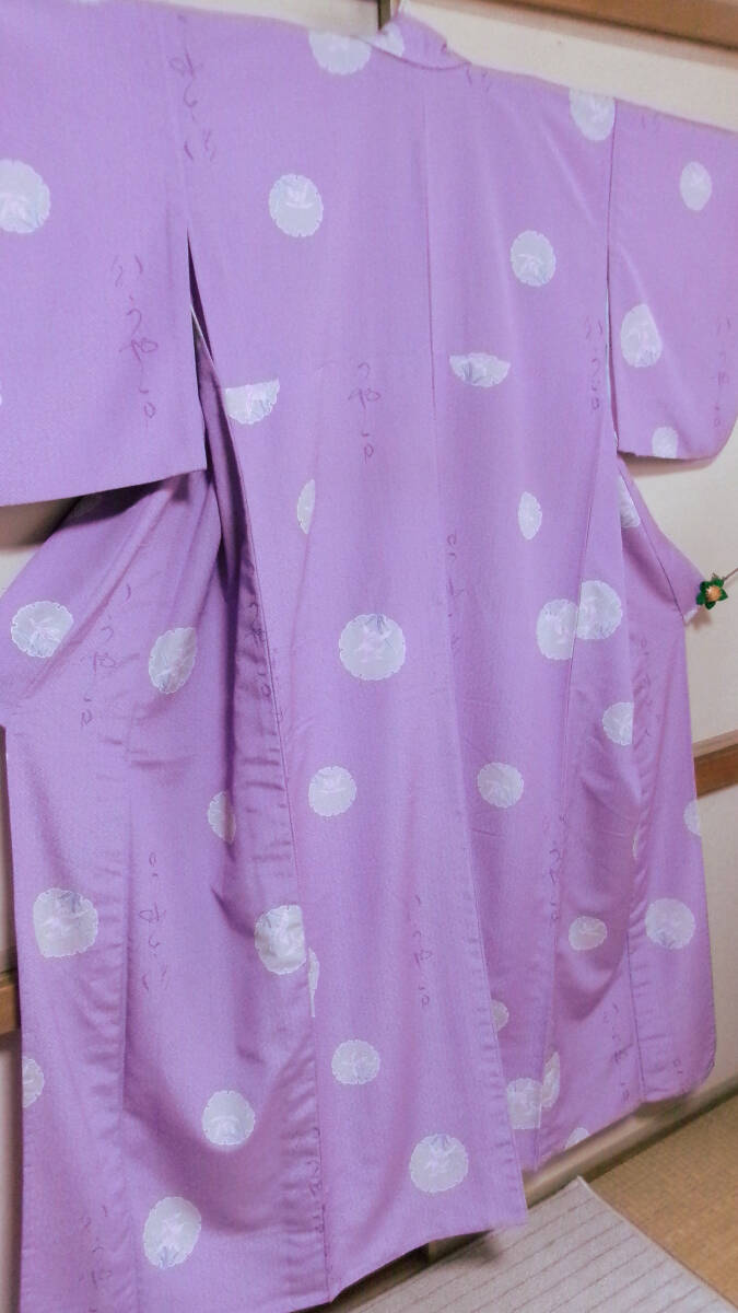 > 125【踊り用】薄紫色系※雪輪柄※紗綾形※重ね衿付き※居敷当て付※洗える※うそつき袖付き※単衣※着物 丈158 裄69