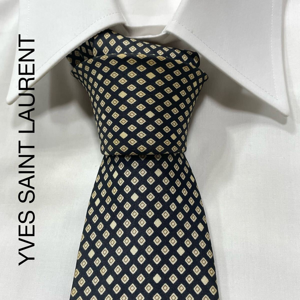 - YVES SAINT LAURENT イヴサンローラン パターン柄 シルク ネクタイ ネイビー ベージュ ブラウン TG2616