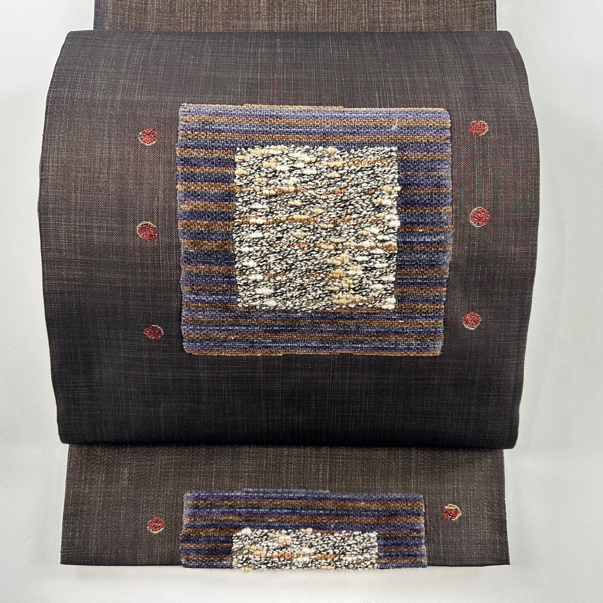- 袋帯 美品 名品 モール 幾何学 縞 金糸 箔 焦茶色 お太鼓柄 正絹 【中古】