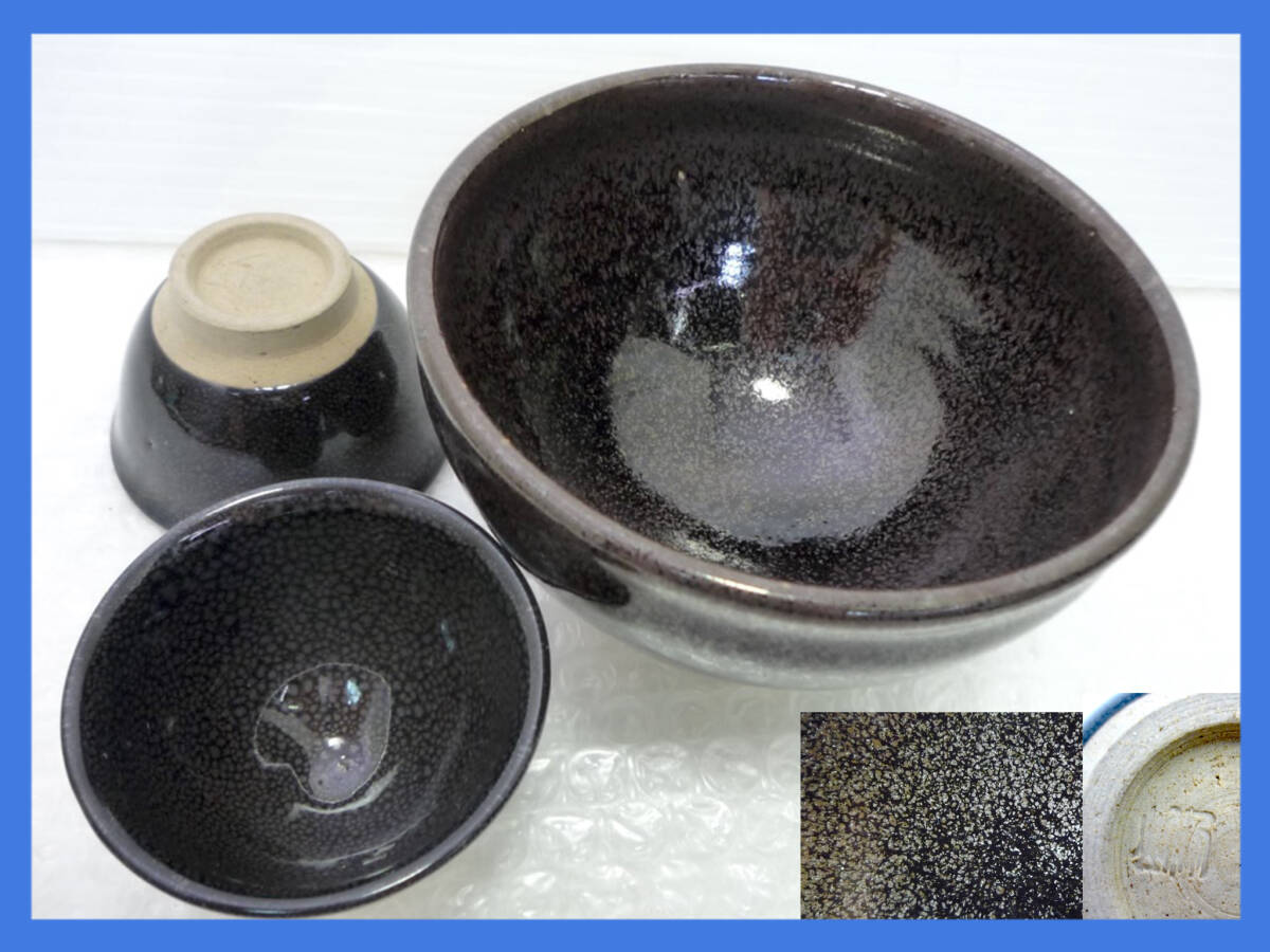 - 旧家蔵出 激レア 曜変天目 天目茶碗 抹茶碗&お猪口2個セット 斑紋 妖艶 銘有 湯呑み 湯飲 ぐい呑 酒器 茶碗 優作 銀油滴 星空幻想的紋様_F