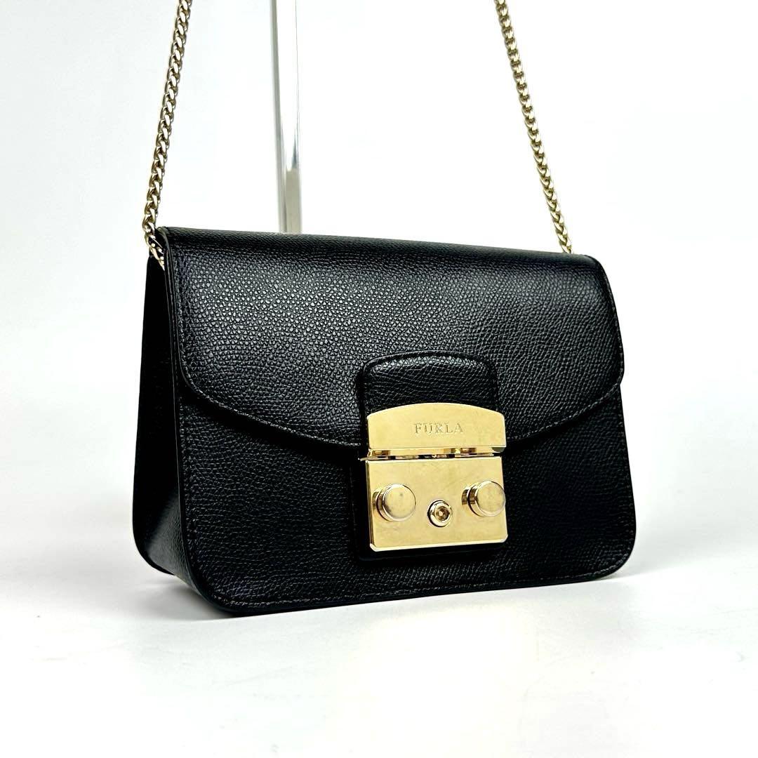 - 極美品●FURLA フルラ メトロポリス ショルダーバッグ チェーン ゴールド金具 斜め掛け シボ革 レザー オニキス ブラック 黒 フォーマル