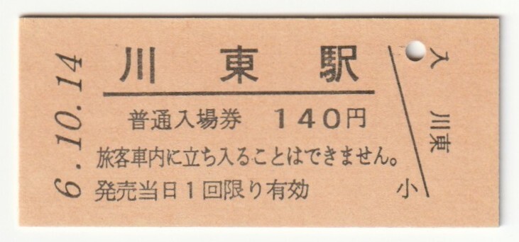- 平成6年10月14日 水郡線 川東駅 140円硬券普通入場券(日付印刷)