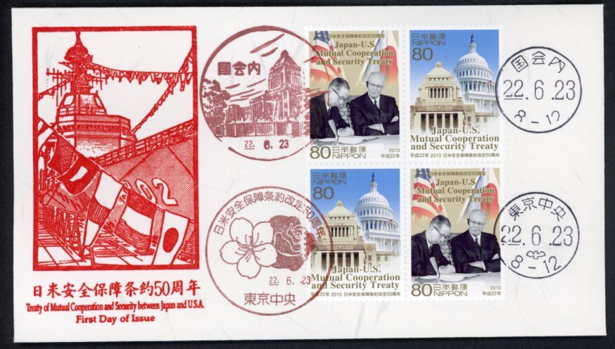 - 1349 【FDC】日米安全保障条約50周年[国会内、東京中央/22.6.23/鳴美版](解説書なし)