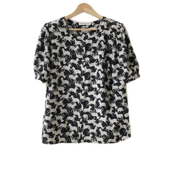 > ハナエモリ HANAE MORI 半袖シャツブラウス サイズ7 S - 黒×白×グレー レディース ゼブラ/肩パッド/HANAE MORI TOPS 美品 トップス