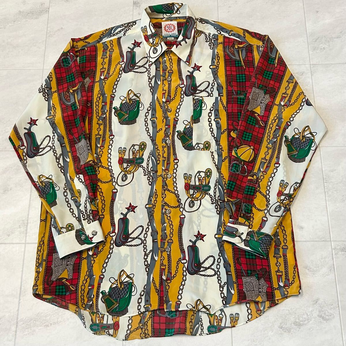 - GIGOLO CLUB 総柄 柄シャツ 宝飾 チェーン 鞄 ベルト チェック レトロ アート ビンテージ 長袖シャツ ポリエステル100%