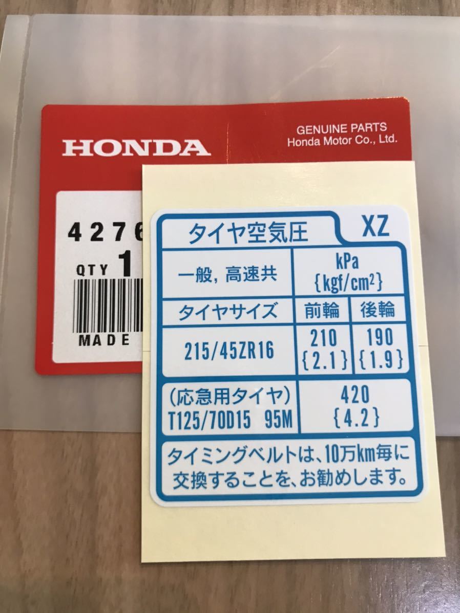 > ■■■①在庫有 絶版品 生産終了 ラスト1枚 正規品ホンダ純正 DC2 ステッカー 空気圧コーションラベル ドア内側 インテグラ タイプR TYPE-R