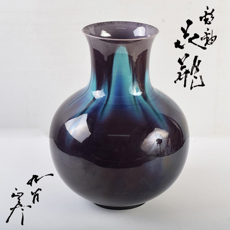 - 九谷焼 柳雨軒 三代八十吉 徳田正彦作 彩釉 花瓶 共箱 MKWP