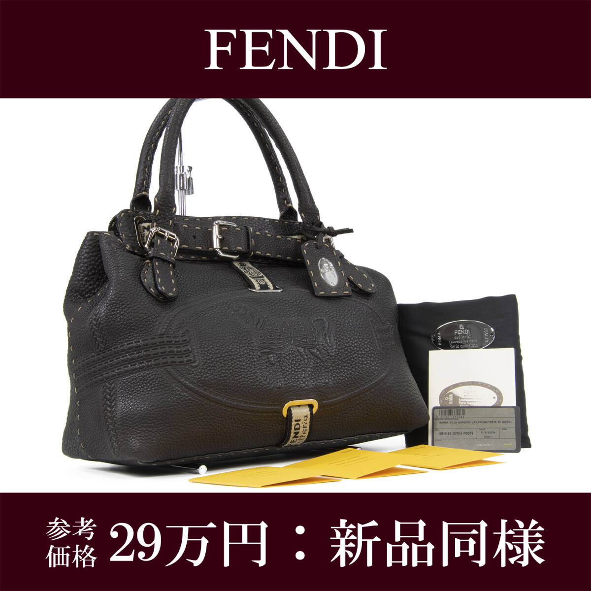 - 本物 送料無料 フェンディ ハンドバッグ 新品同様 レディース セレリア 茶色 ダークブラウン 馬 ロゴ マーク 本革 レザー 鞄 バック E409