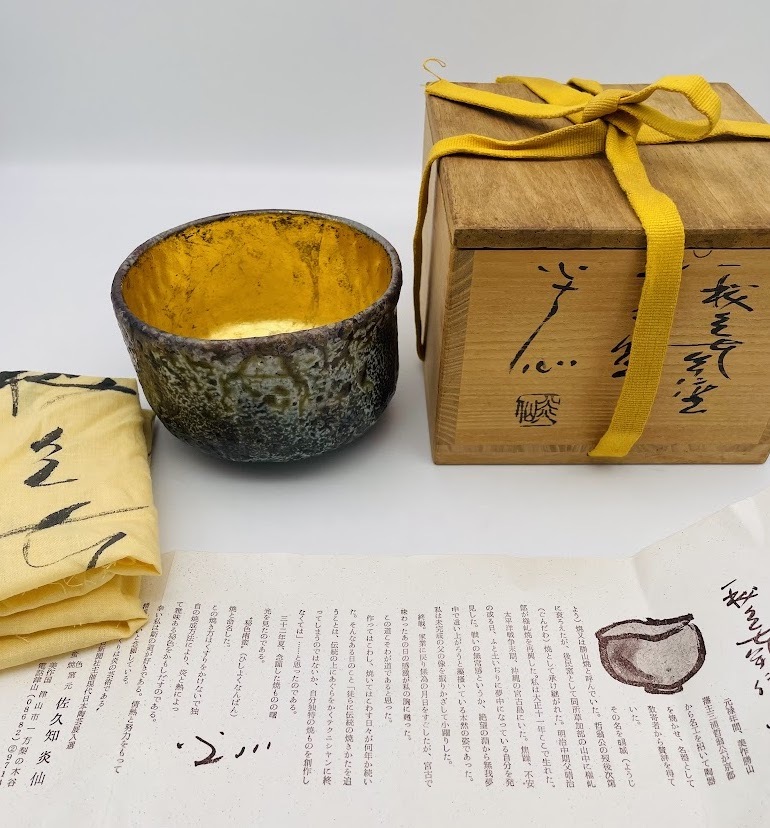 - 《本物保証》佐久知炎山『秘色南蛮焼』茶碗 陶磁器 名匠 備前焼 希少品 金彩 さくち えんせん 茶道具 木箱付 R7-0120