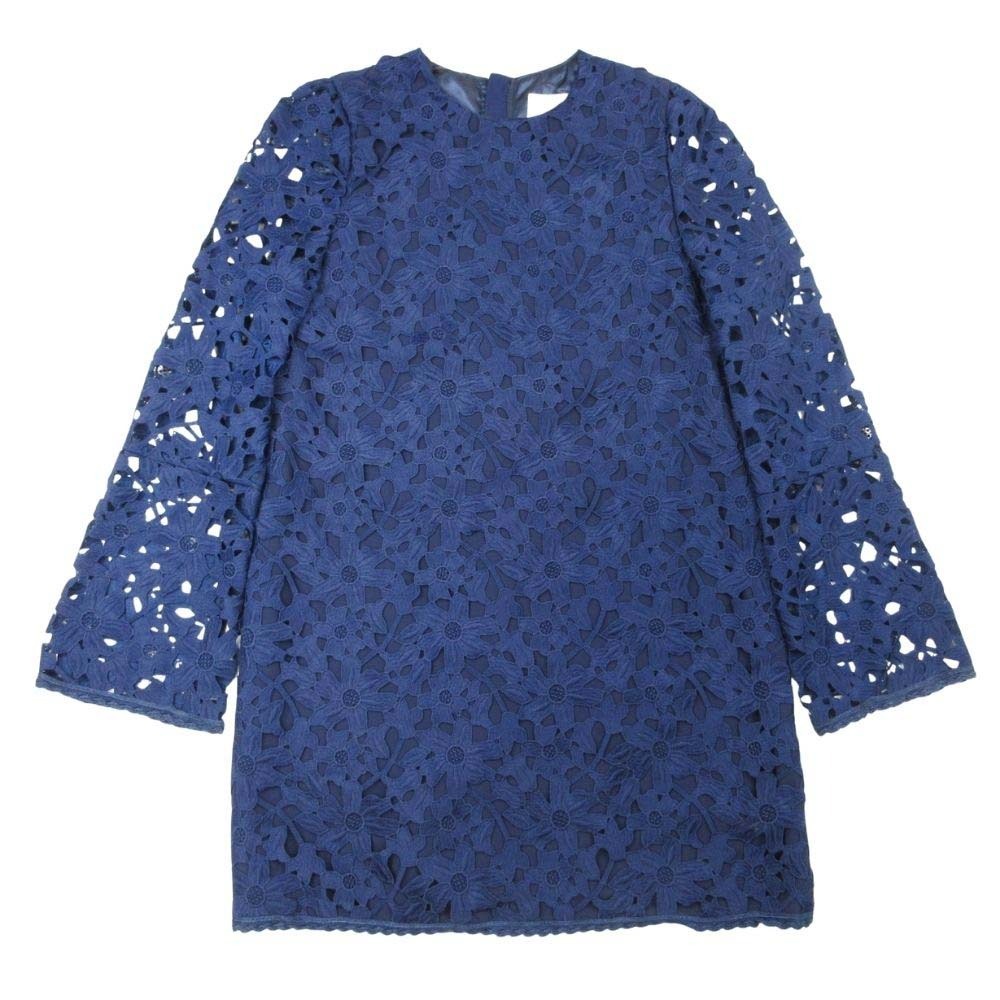 > 美品 Language ランゲージ ワンピース クロシェ レース 切替 長袖 膝丈 バックジップ 紺 ネイビー