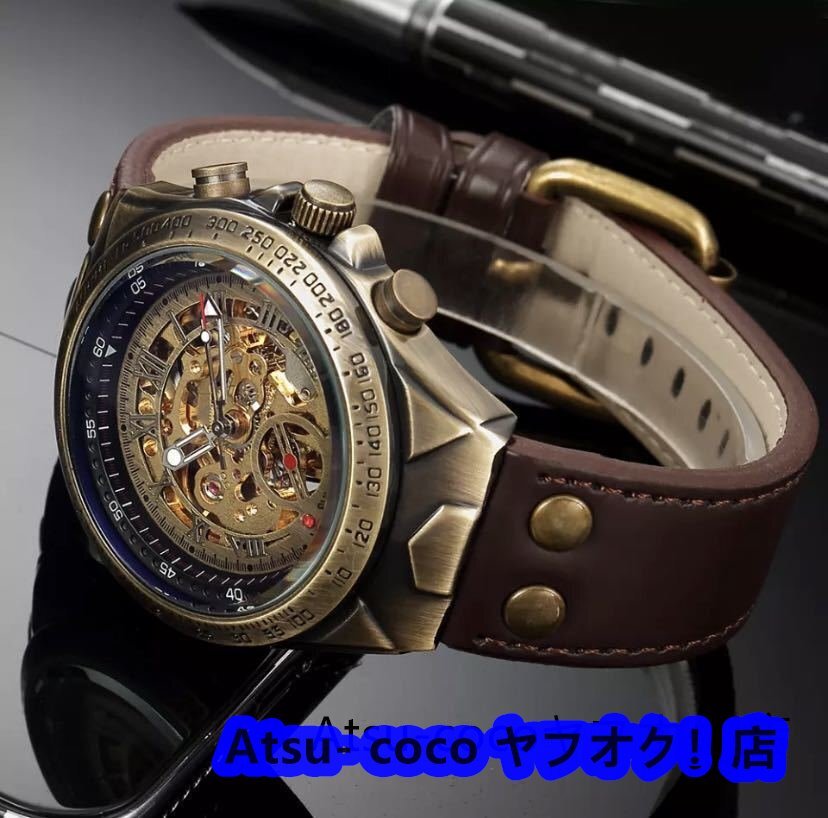 - メンズ腕時計 機械式 時計 男性 自動 スケルトン ブロンズ 革 スチーム パンク 透明