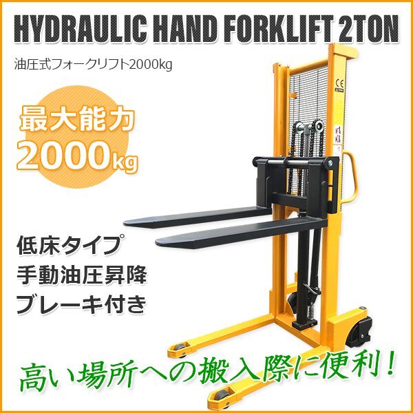 - 手動タイプ免許不要 ハンドフォークリフト 2t低床 油圧手動フォークリフト ハンドリフト 2000kg 最高位1600mm 【チャーター便 】