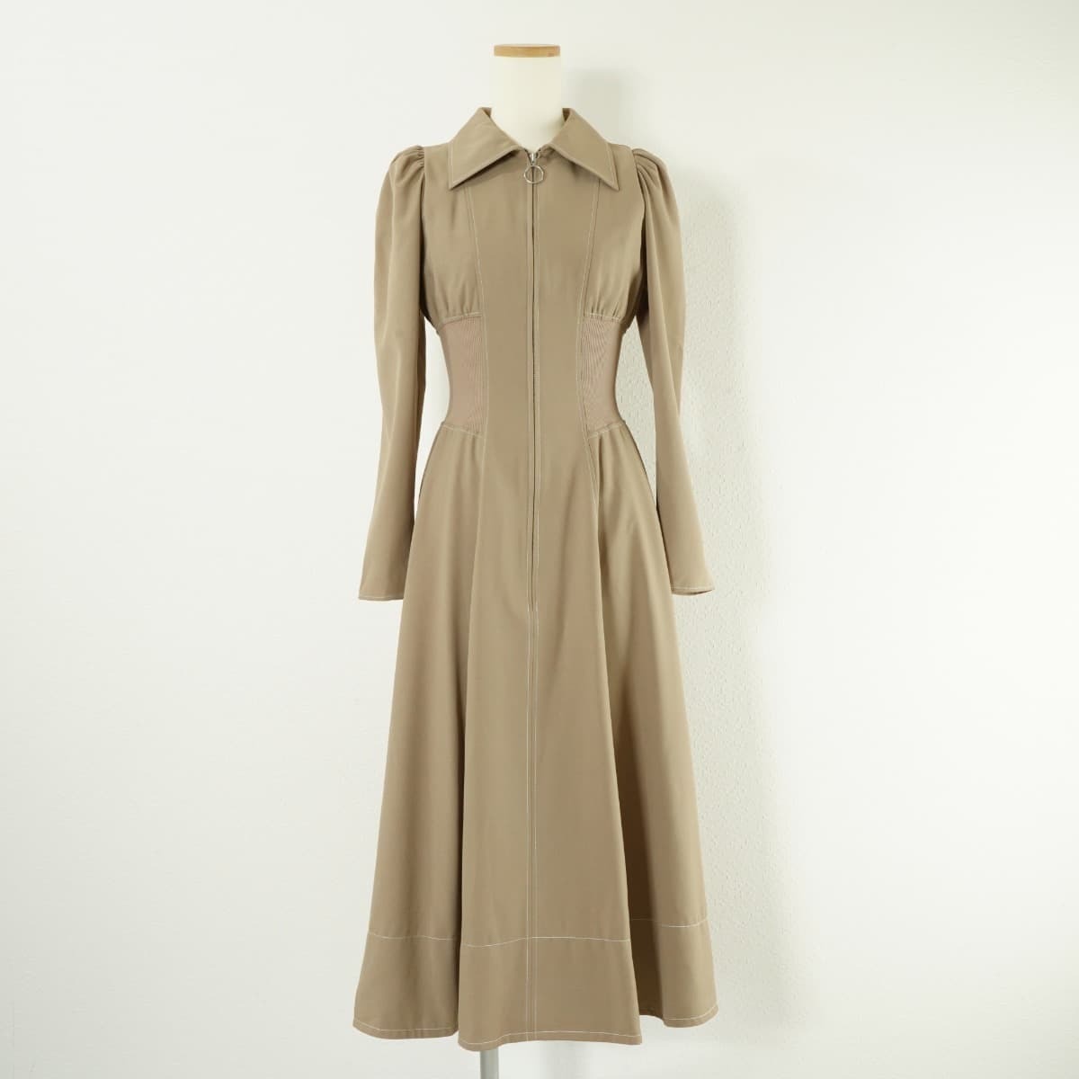 商品名:And Couture アンド クチュール ウエスト リブ フロント ジップ ワンピース フレア ロング 長袖 襟 ベージュ