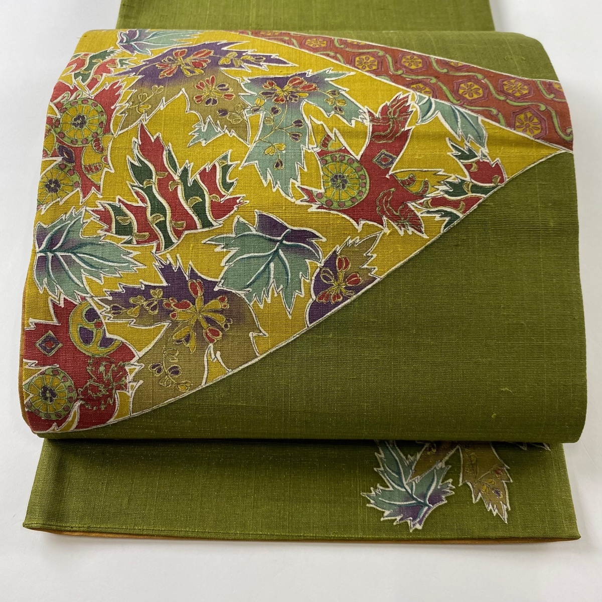 - 袋帯 美品 秀品 紬地 草花 葉柄 金通し ぼかし 鶯色 お太鼓柄 正絹 【中古】