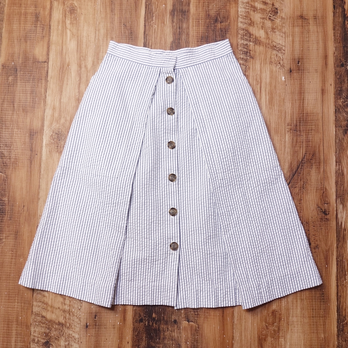 > 美品 ザシンゾーン THE SHINZONE シアサッカー フロントボタンスカート レディース Aライン ひざ丈 ストライプ 36 Sサイズ LA3
