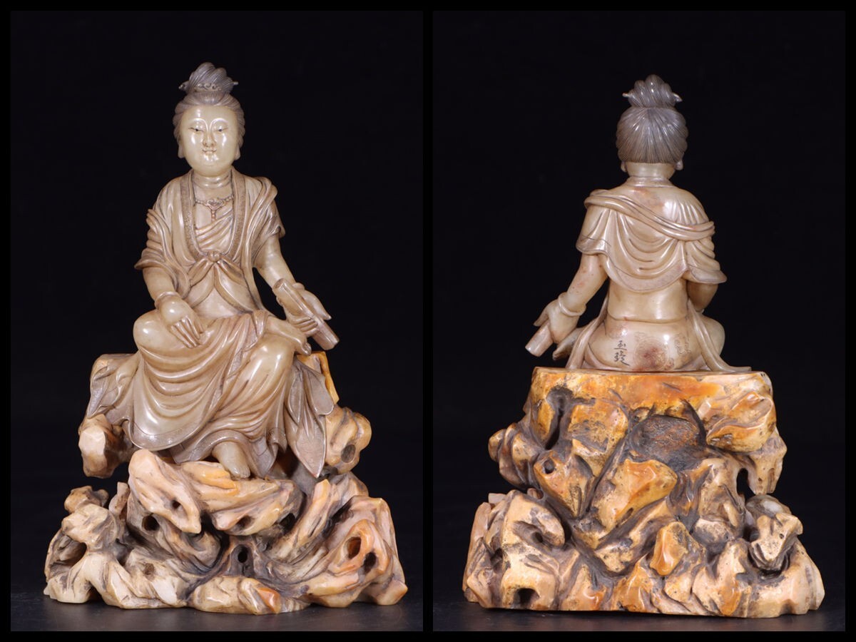 - 「清 玉セン作 老寿山石 芙蓉石彫り 持経観音造像」極細工 擺件 古賞物 中国古美術 旧蔵出