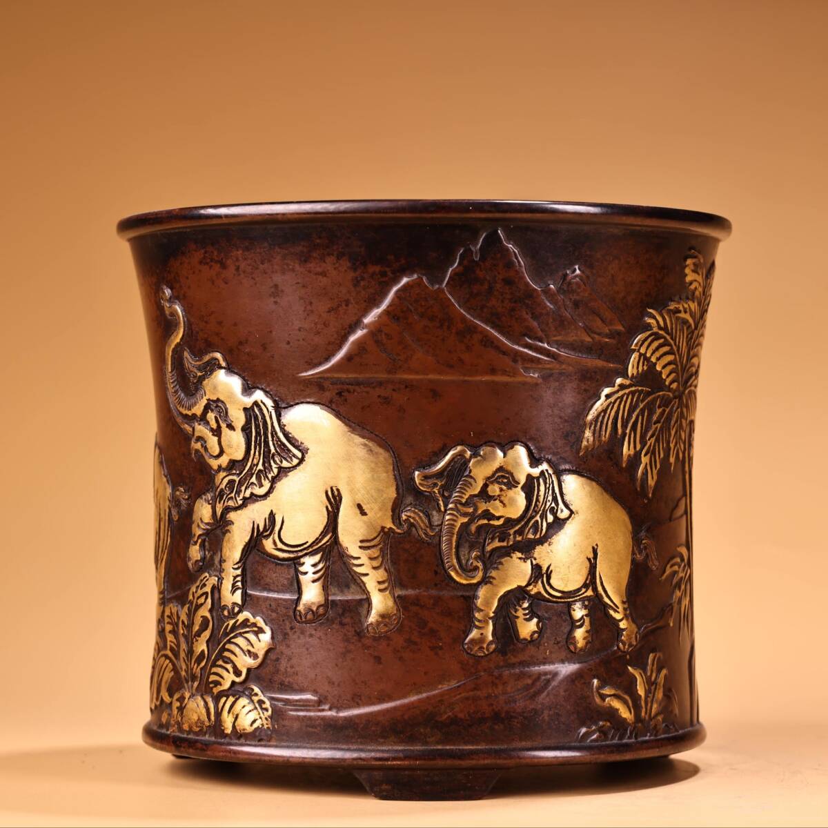 - ▽鴻▽ 紫銅製 塗金 大象紋 筆筒 置物 賞物 古賞物 古董品 時代物 稀少珍品 中国古玩 中国古美術