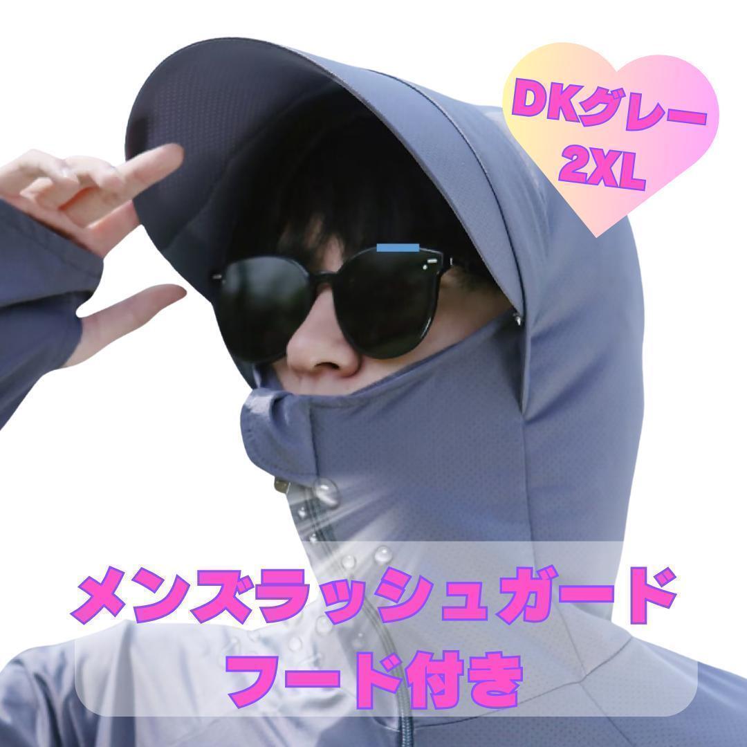 - UVパーカー ラッシュガード 長袖 紫外線 日除け フード ダークグレー 2XL