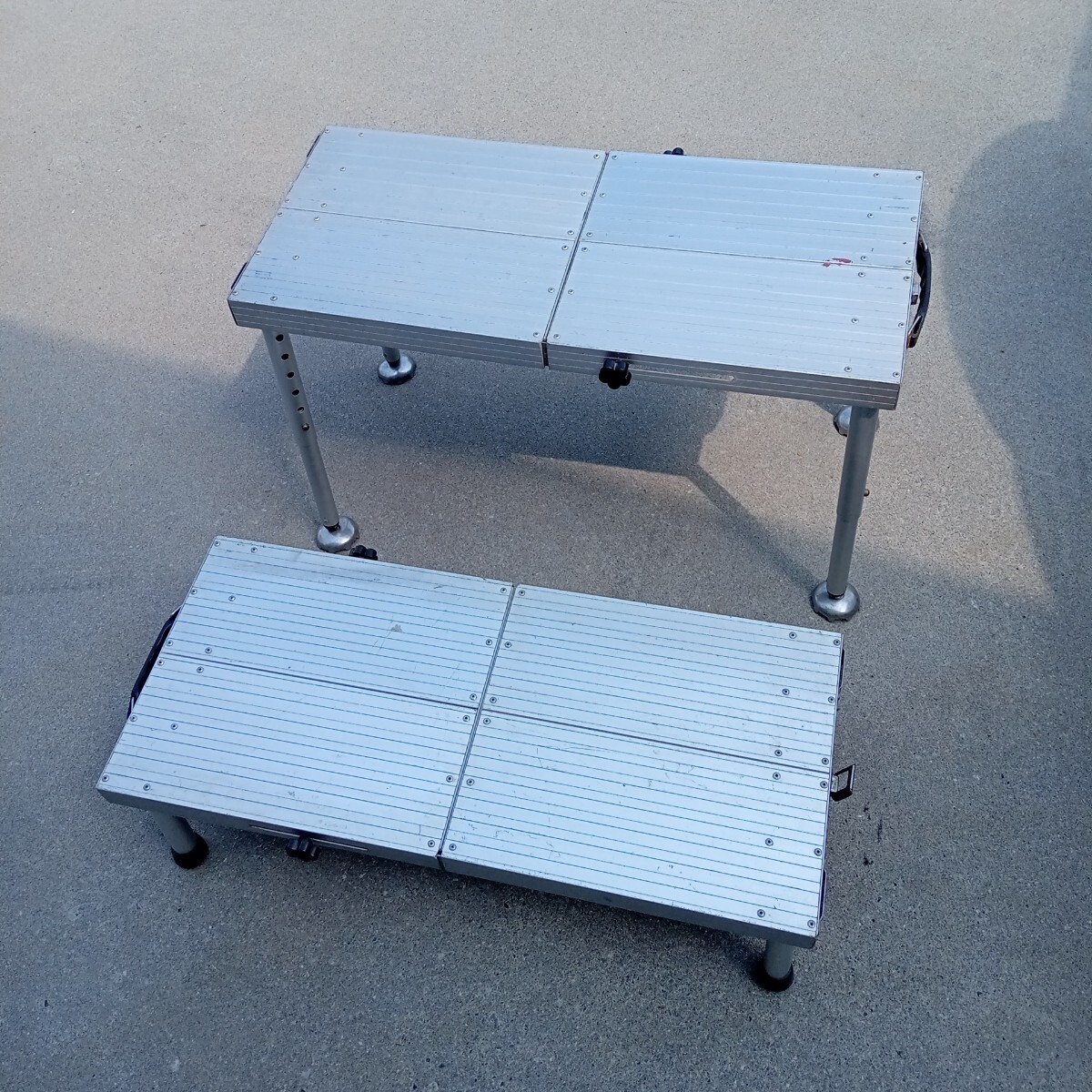 - ヘラブナ釣り★アルミ製ヘラ台×2個 寸法 縦640×横280×高さ205mm 固定・640×280×385〜265調整式 汚れ有