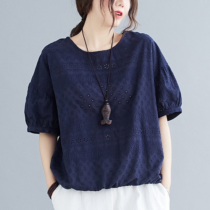 - レディース春夏レース刺繍綿半袖涼しいゆったりブラウスシャツ ネイビー aa510