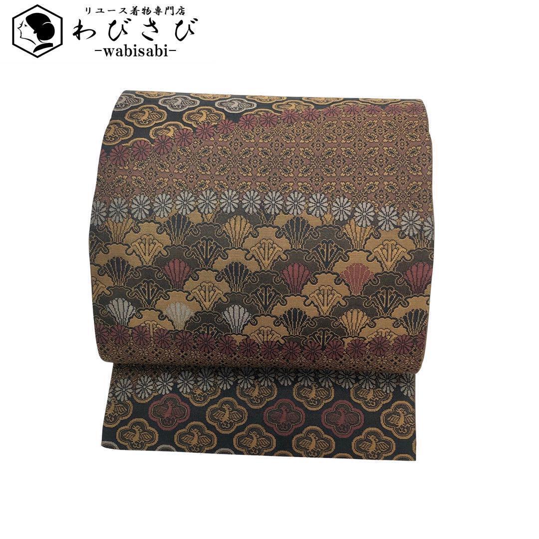 > 袋帯 横段織模様 花模様 鳥 寄せ柄 黒色 O-3474 着物 きもの kimono 和服 和装 中古 リサイクル着物 【送料無料】