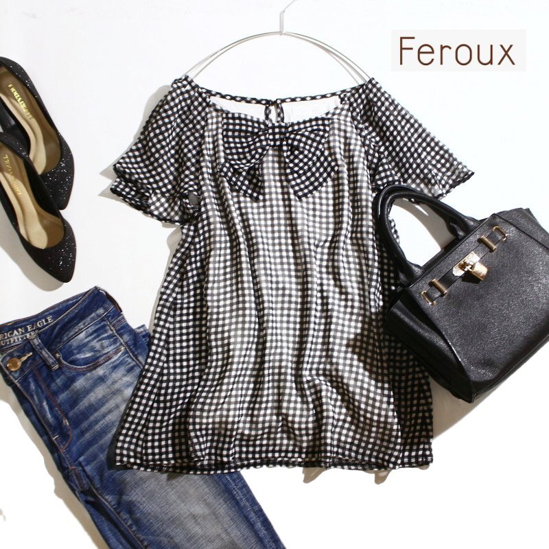 - 美品 Feroux フェルゥ 株) オンワード樫山 夏 格子柄 モノトーン 可愛い フリル ジャージ― 半袖 カットソー 9号 2 ブラック 黒 ホワイト
