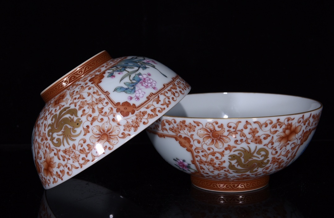 - ■LH205■大清雍正年制銘 礬紅粉彩の花卉紋碗2客 時代物 古玩 唐物 古陶磁器■