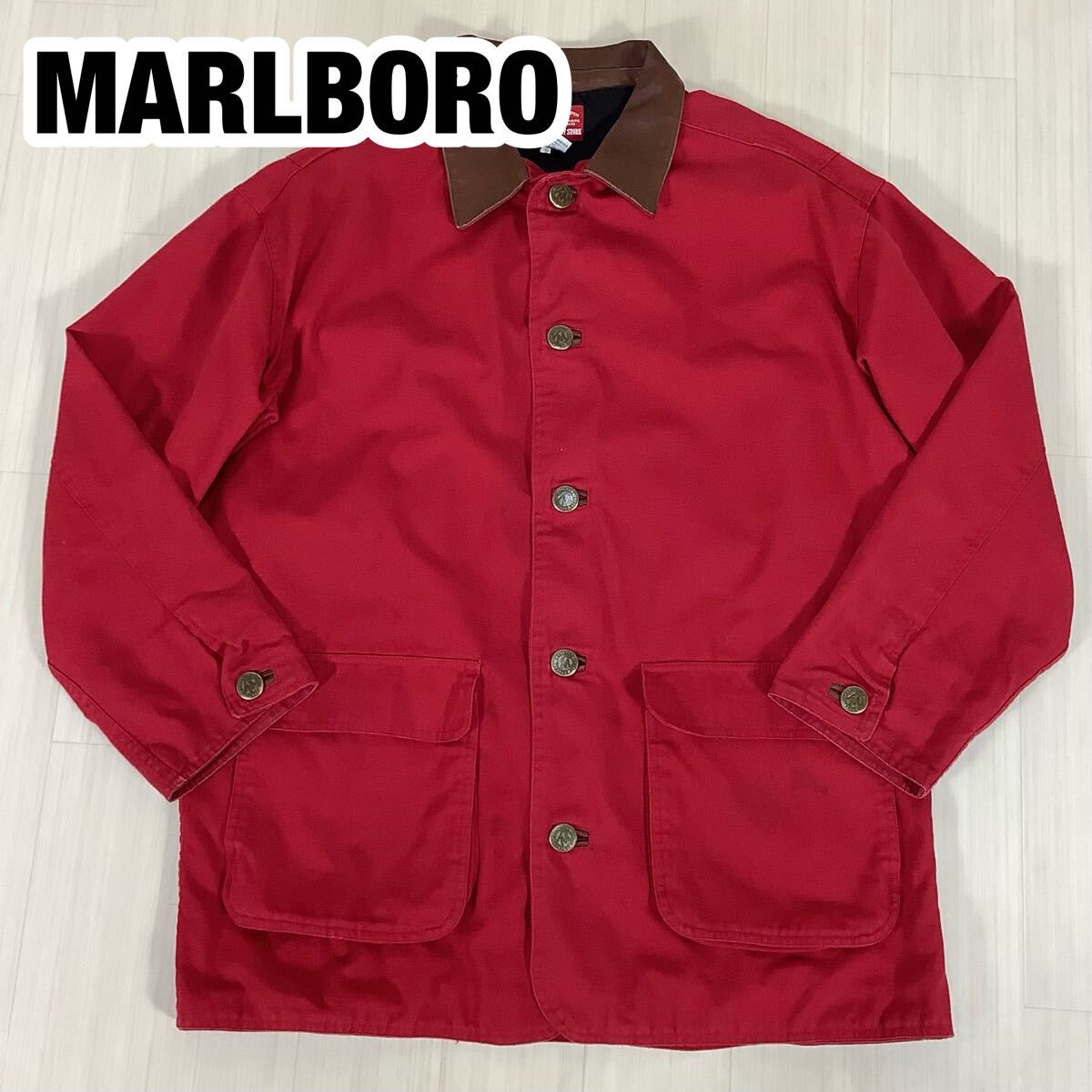 - 90s 90年代 MARLBORO マルボロ ハンティングジャケット カバーオール M 襟レザー レッド 赤 コットン ダック地