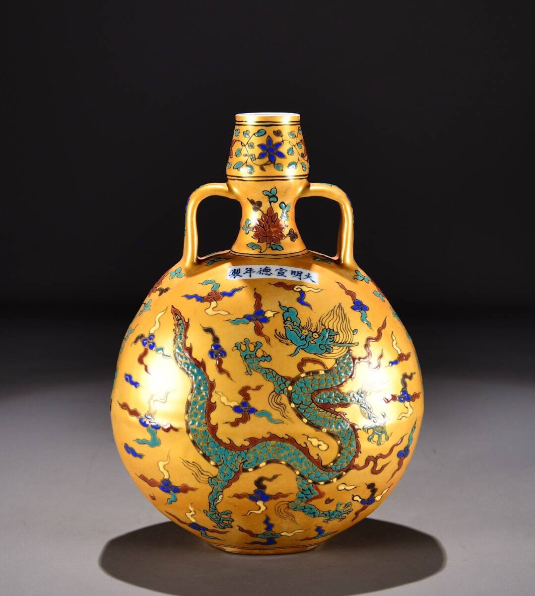 - 蔵友旧蔵出 明 成化年製款 金地 五彩 神龍紋 扁瓶 稀少珍品 貴重品 古陶瓷品 置物 古賞物 中国古玩 中国古美術品
