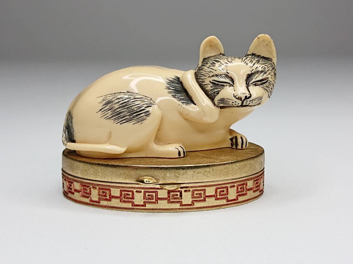 > ■ESTEE LAUDER 1980年代 エスティローダー シナバー ソリッドパフューム 練り香水 コンパクト 空容器 猫 ねこ 置物 小物入れ