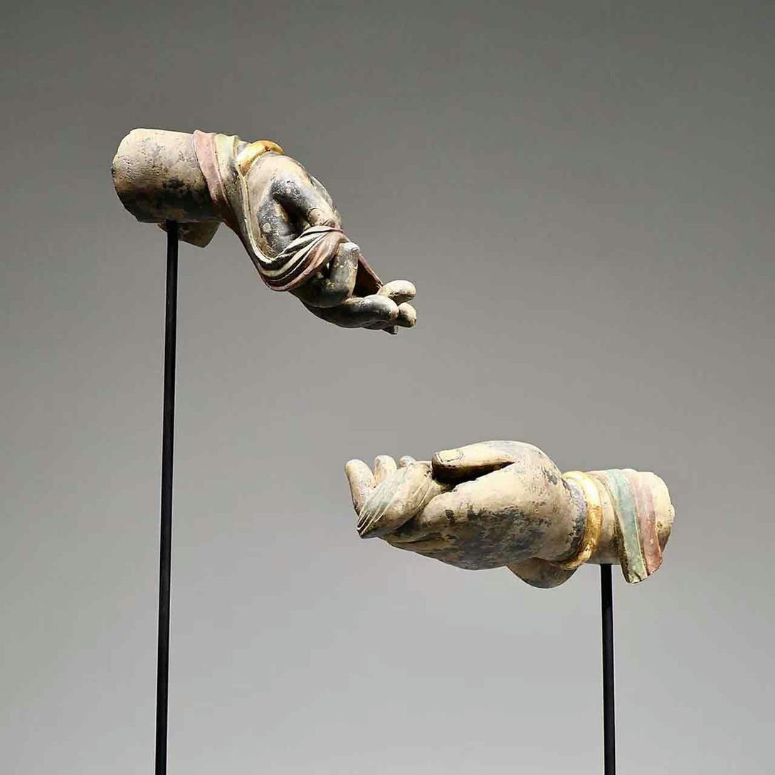 - ▼渡鶴羽▼W6663唐時代 青石彩絵仏手一対 青石細工彫刻★仏教古美術★仏像★細密細工★廃寺旧蔵★廃寺買出品