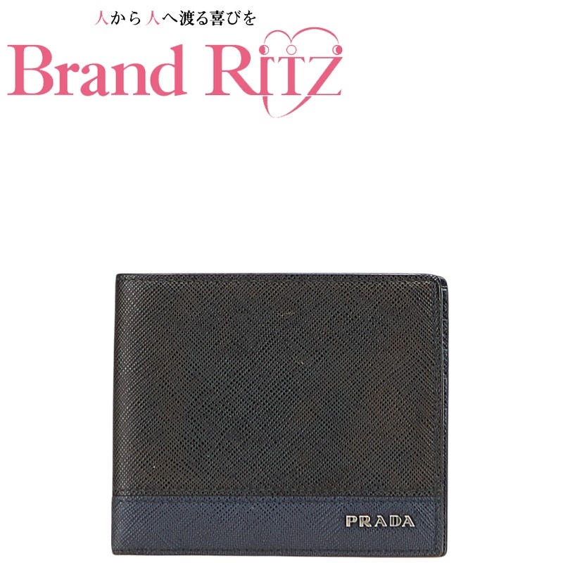 > 中古 プラダ 二つ折り財布 ABランク ブラック ネイビー サフィアーノレザー メンズ PRADA【送料無料】【西神店】