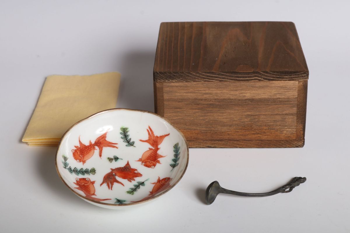 - 9456 中国陶器 手書 金魚文小盤 水滴(木箱・匙付) 文房具 書道具 検:清朝 色絵 故宮 紫禁城 中国 古玩 唐物