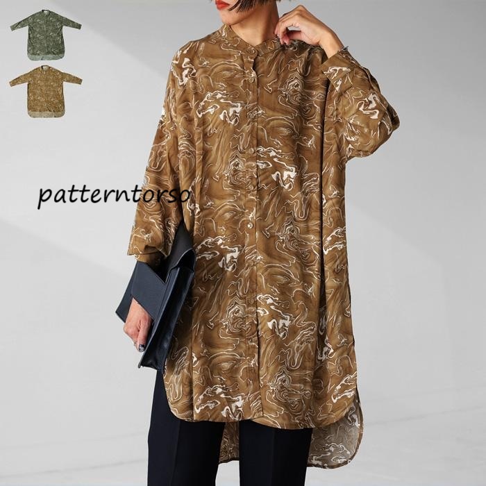 - 新品同様 パターントルソー アンティカ patterntorso antiqua マーブル 総柄 オーバーサイズ バンドカラー シャツ ワンピース FREE