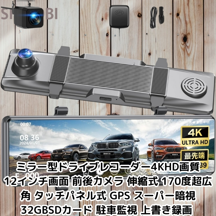 > ミラー型ドライブレコーダー4KHD画質 12インチ画面 前後カメラ 伸縮式 170度超広角 タッチパネル式 GPS 32GBSD 駐車監視 上書き録画