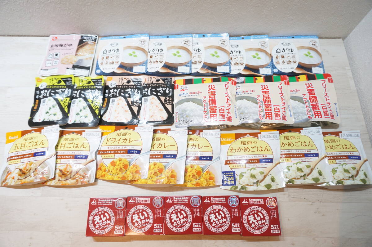 > 【J10.O】大量! 26食 非常食 玄米梅がゆ/白がゆ/白飯/おにぎり/五目ごはん/ドライカレー/わかめごはん えいようかん 賞味期限:2025.8-10