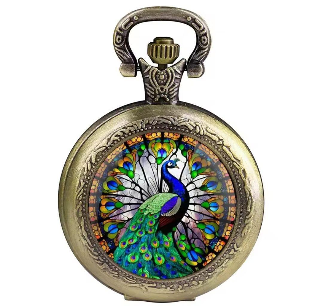 - 孔雀デザイン 懐中時計 チェーン付き(ブロンズ)