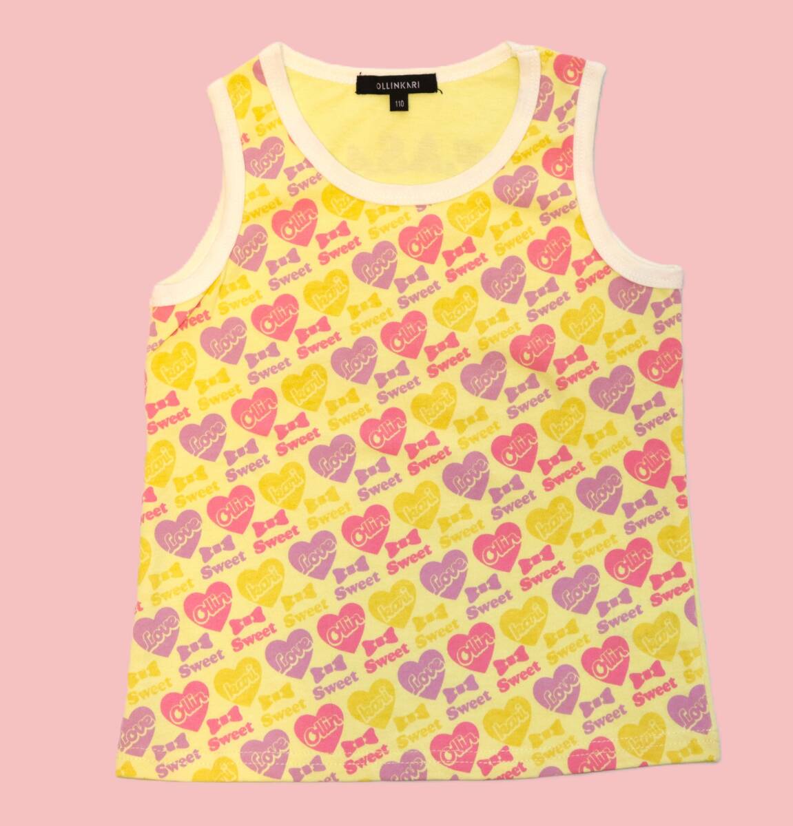 > 新品未使用 OLLINKARI オリンカリ 可愛い&カッコイイ 黄色タンクトップ ハート・リボン・英字プリント 110㎝ 100㎝ (株)ワールド