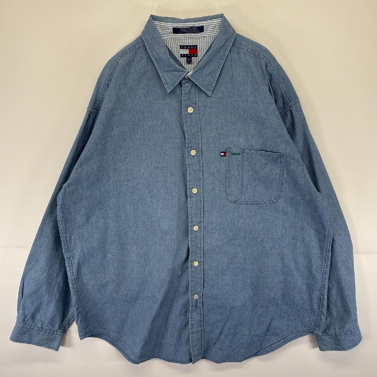 - 古着 トミージーンズ TOMMYJEANS 長袖 長袖シャツ ワンポイントロゴ 胸ポケット シャンブレー デニムシャツ XXL ブルー メンズ