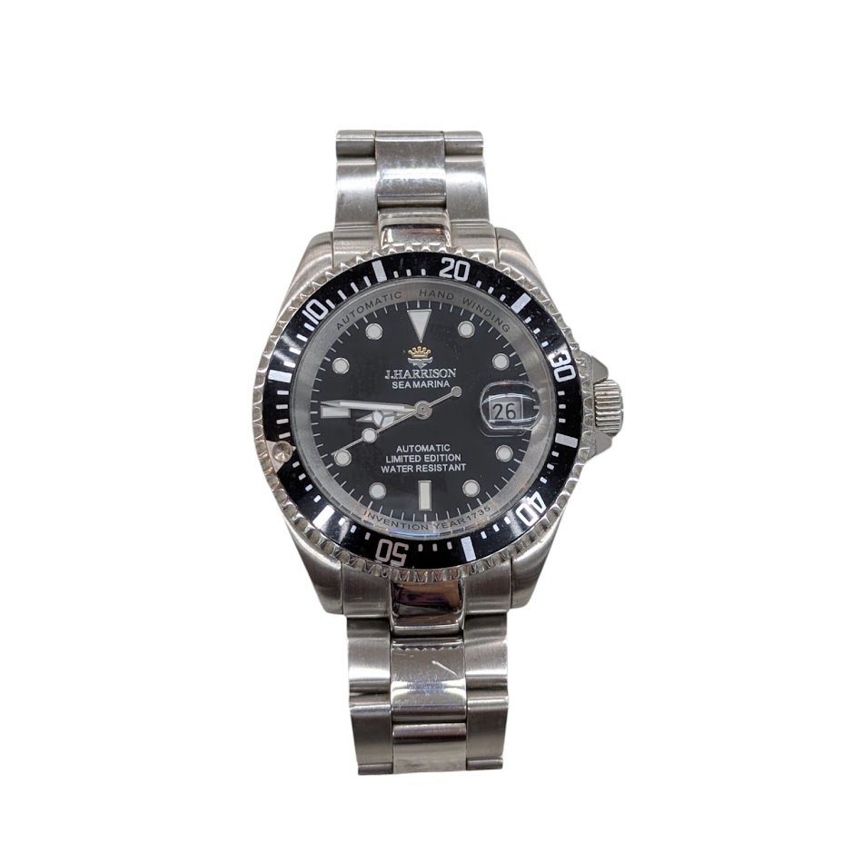 - J.HARRISON SEAMARINA ジョン・ハリソン J.H-010 シーマリーナ 自動巻き アナログ デイト 裏スケ 3針 黒文字盤