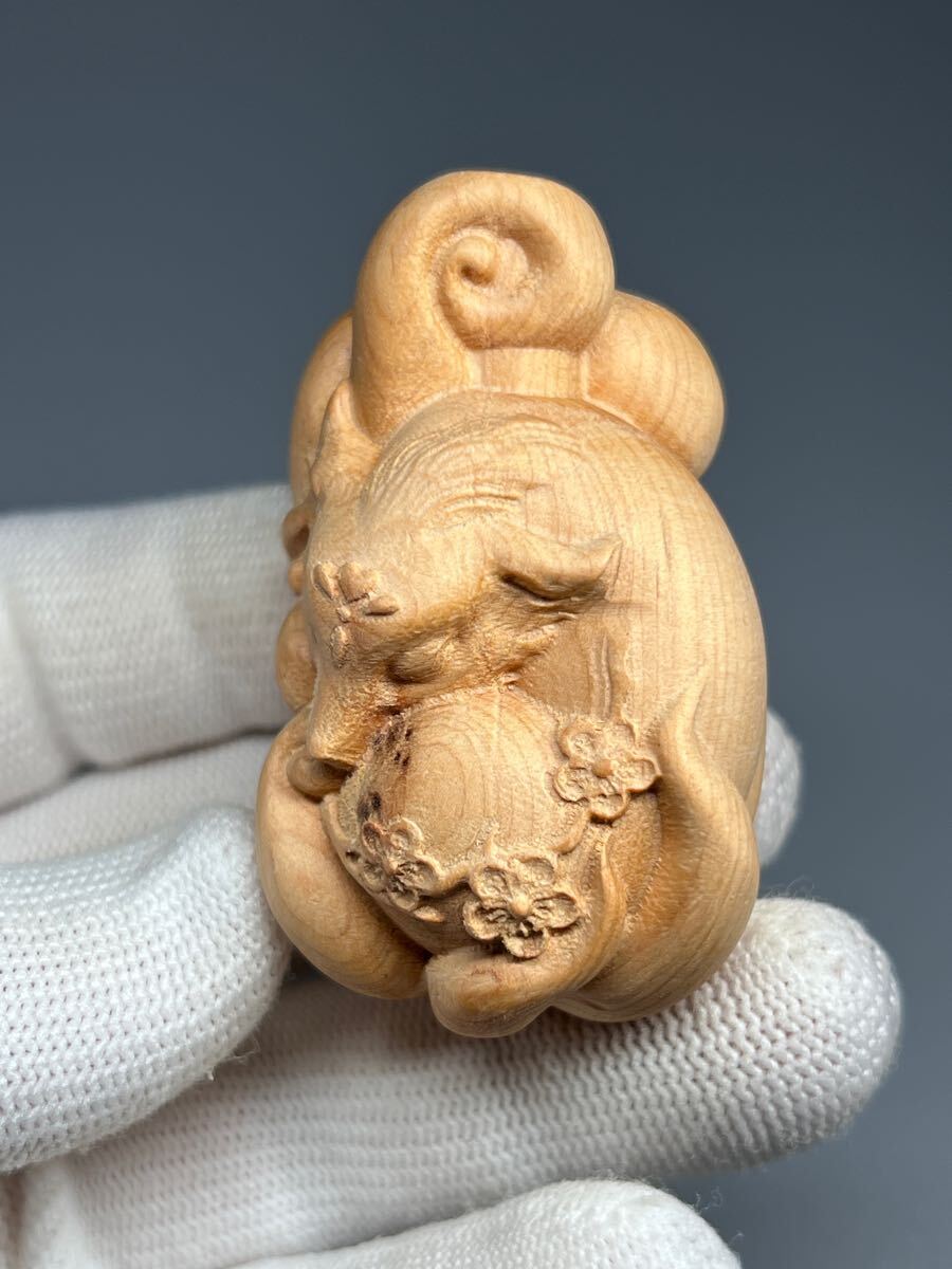 - セール 木彫り 崖柏木 細工彫 九尾の狐 梅 縁起物 木製
