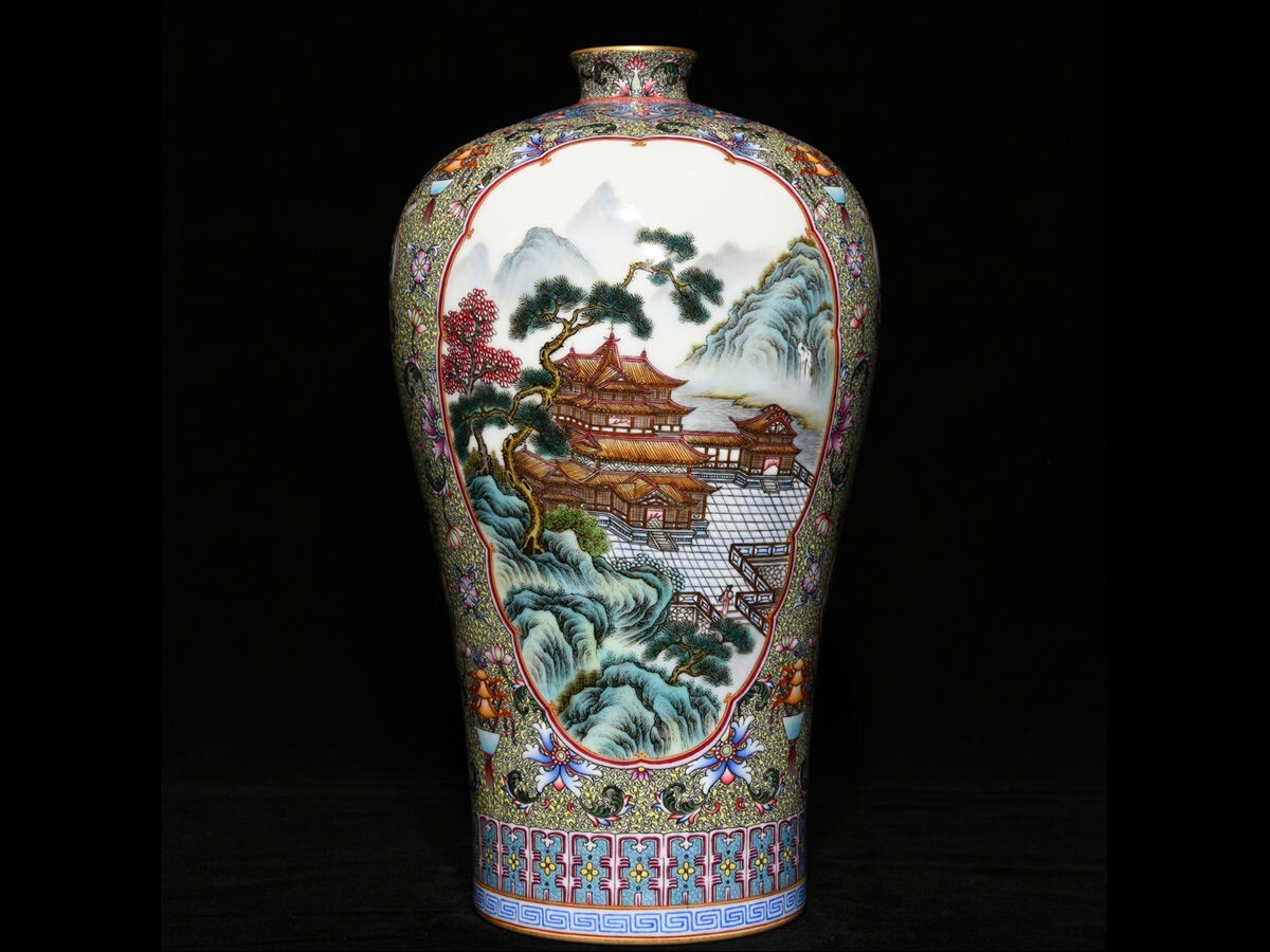 - 「清 雍正年製 陶磁器 古月軒粉彩開窗山水閣樓紋 梅瓶」染付 置物 擺件 古賞物 中国古美術 旧蔵出