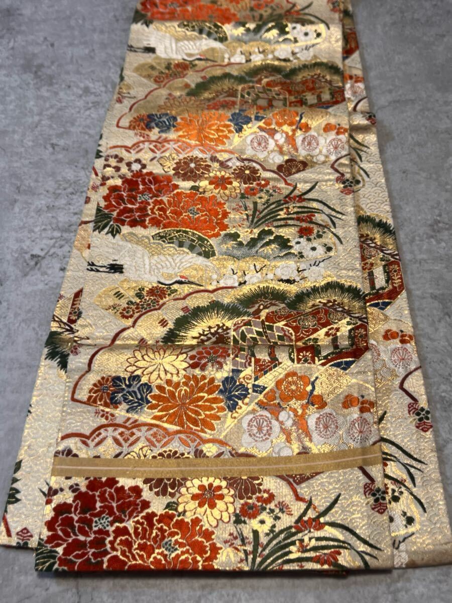 - 帯 丸帯 アンティーク 両面 金糸 全通 織物 正絹 着物 絢爛